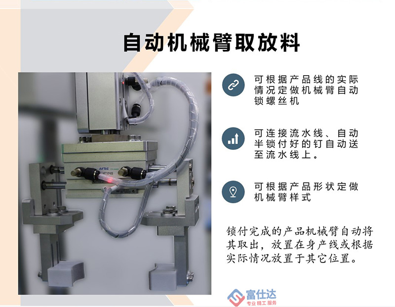 富仕達擁有獨立研發設計團隊,10多位自動化高級工程師,5000㎡自動鎖螺絲機生產、測試車間,專業售后服務團隊,為客戶提供方案設計、設備制造、操作培訓、售后服務等一站式服務。 公司將持續提升技術創新和產品服務方面的優勢,堅持“專業、精工、服務”的企業理念,聚焦于自動鎖螺絲設備生產,通過系統的一站式解決方案,真正的幫助客戶提升效率、降低成本,提升客戶的核心競爭力。