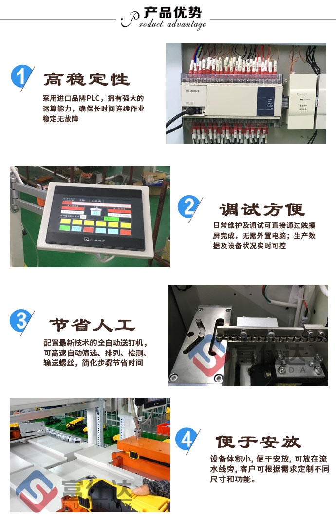 主要由自動送釘機、逐點鎖付系統、PLC控制程序、自動鎖螺絲程序等組成,通過設定螺絲孔坐標點位來逐點擰螺絲,定位精度較高:±0.02mm,設備可根據不同產品螺絲孔位情況,設定并儲存不同鎖付方案。生產中可快速切換方案來實現對不同產品鎖付,靈活性較好。也可根據生產要求配置多把電批同時作業,以提升效率。比較適合螺絲數量較多,且鎖付精度較高的產品,尤其適合產品型號眾多的企業。