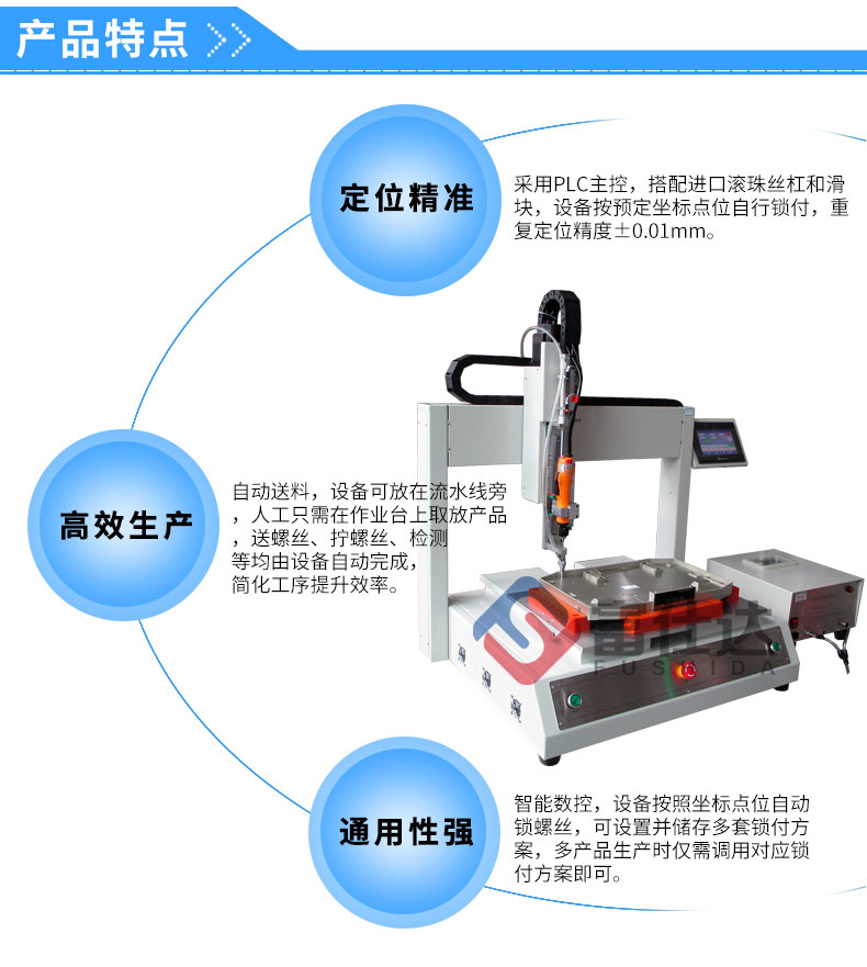 富仕達單平臺自動鎖螺絲機是指單平臺坐標式自動鎖螺絲機,通常用在面積較大產品,如:寫字板、大家電、天花吊頂、大型玩具及大型LED模組等。
