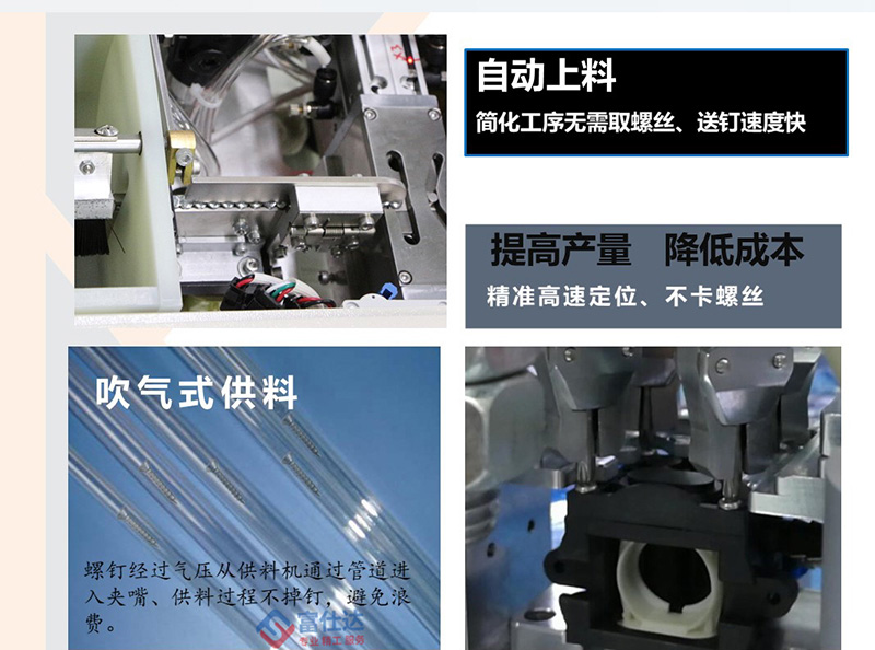 設備主要由自動送釘機、多軸鎖付系統、多工位作業臺、機械手臂等機構組成,根據產品螺絲數量定制多軸鎖付系統及自動送釘數量,達到一次輸送并擰好所有螺絲的效果,大幅提升效率,簡化工序。